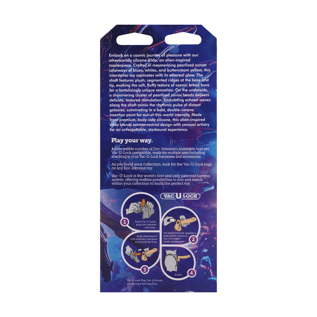 Embárcate en un viaje cósmico de placer con nuestro dildo de silicona de otro mundo. Una obra maestra inspirada en extraterrestres. Elaborado con hipnotizantes tonos nacarados de atardecer en azules, blancos y amarillo crema, este juguete interestelar cautiva con su brillo etéreo. El cuerpo presenta suaves crestas segmentadas en la base y la punta, evocando la textura suave y esponjosa de bollos cósmicos para una sensación tentadoramente única. En la parte inferior, un brillante conjunto de perlas nacaradas proporciona una estimulación delicada y texturizada. Ondas ondulantes a lo largo del cuerpo imitan el pulso rítmico de galaxias distantes, culminando en un audaz punto de inserción de doble corona para una intensidad fuera de este mundo. Fabricado con silicona premium, segura para el cuerpo. Este dildo de inspiración extraterrestre combina un diseño de otro planeta con un arte sensual para una experiencia inolvidable y estelar.